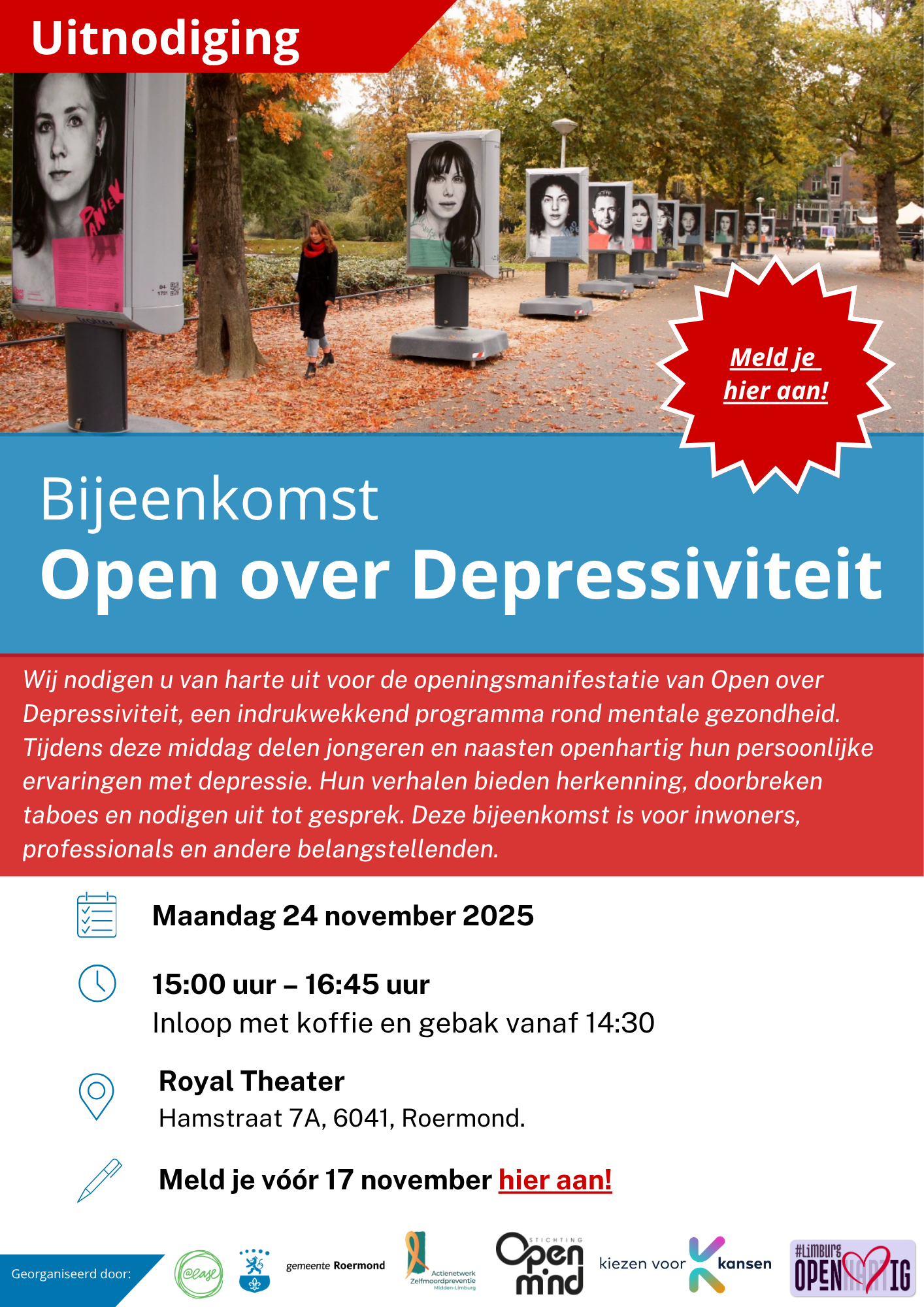 Op maandag 24 november wordt de buitententoonstelling Open over Depressiviteit geopend in Roermond. Samen met Stichting Open Mind, Actienetwerk Zelfmoordpreventie Midden-Limburg, Limburg Openhartig en @Ease nodigen we jou uit voor de openingsmanifestatie. Een indrukwekkend programma rond mentale gezondheid. Tijdens deze middag delen jongeren en naasten openhartig hun persoonlijke ervaringen met depressie. Hun verhalen bieden herkenning, doorbreken taboes en nodigen uit tot gesprek.